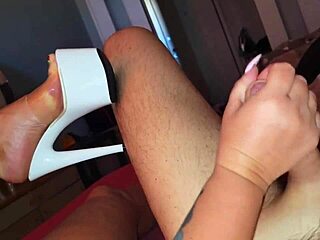 Giving footjob in high-heeled sandals, making him cum on beautiful feet with toes